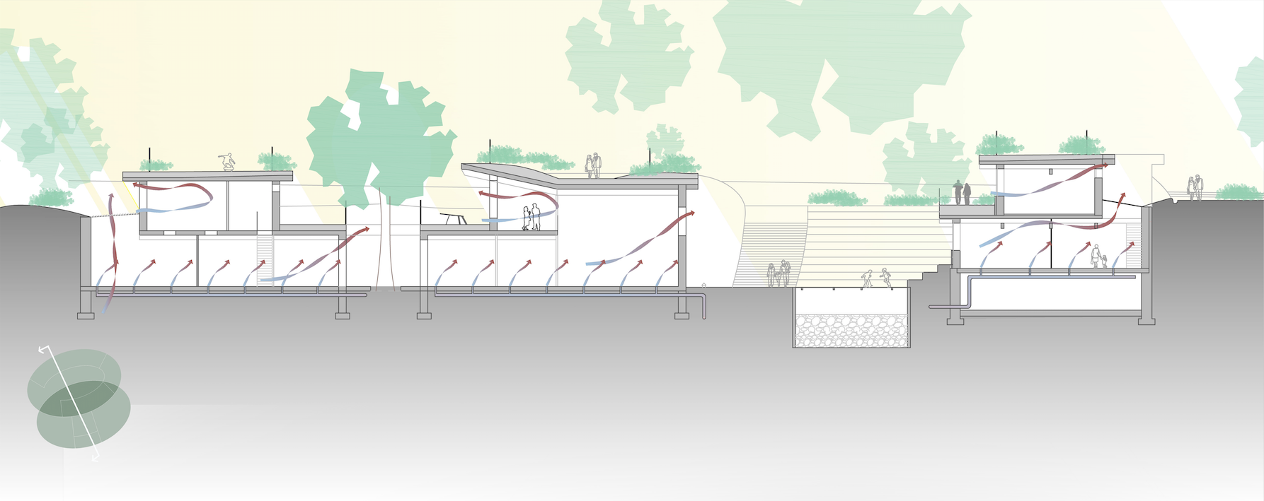 Following this original concept the school is integrated in the park as much as possible. Furthermore the focus was on passive design, using material choice and climate based design to create a building using minimal energy.